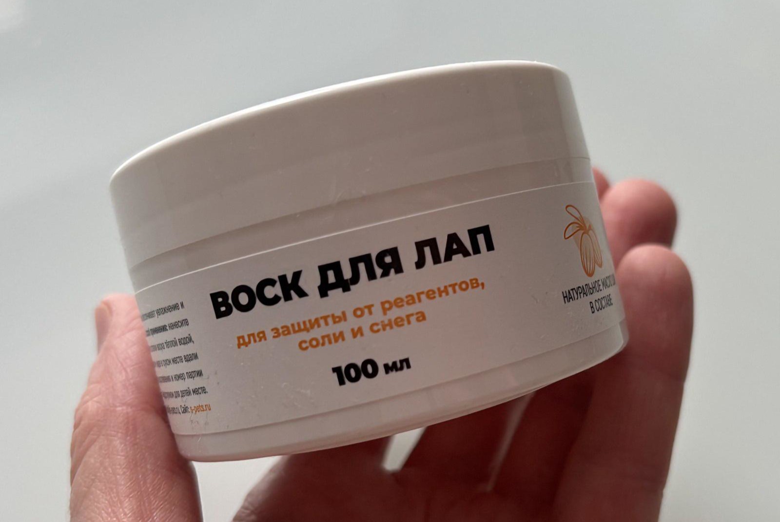 Воск создаёт невидимую, но ощутимую плёнку, которая действительно отталкивает снег и соляные реагенты. После нанесения лапы не примерзают к наледи, а мелкие трещинки заживают за два-три дня регулярного применения. Консистенция густая, но не твёрдая — легко распределяется пальцем без комочков. Расход экономичный: баночки хватает на два зимних месяца ежедневных прогулок по городу.